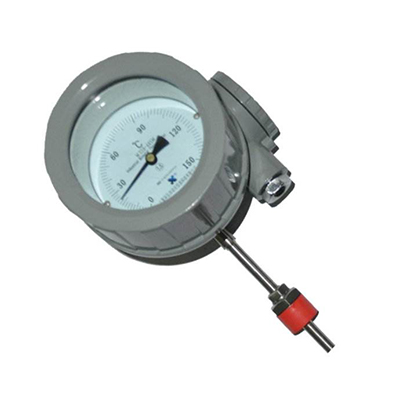 防爆电接点双金属温度计带有电接触装置—即机械电接点。当被测介质温度变化时,自由端上的细轴及转向传动机构带动指针及动触点转动,在标度盘上指示出温度的变化值,当其与定触点(上、下限定触点)接触或断开的瞬时,使电路系统中的继电器及接触器动作,以达到自动控制和报警的目的。